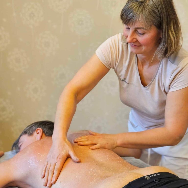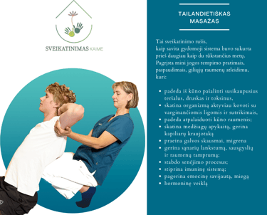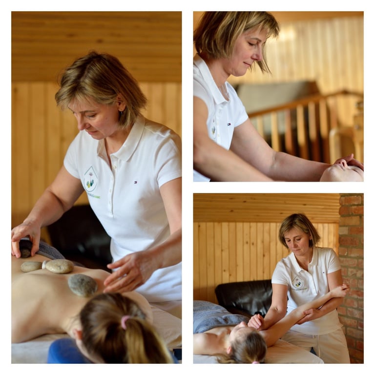 Masažas – tai kelionė į gilesnį atsipalaidavimą ir sveikatos atstatymą. Naudojame papildomąsias ir alternatyviąsias sveikatinimo technikas: kinezilogiją, reiki, Tailando masažo metodus, akupresūrą, cranio sakralinę terapiją bei taurių procedūras. Kiekvienas prisilietimas skirtas atgaivinti kūną, subalansuoti energiją ir atkurti vidinę harmoniją. Atpalaiduojantys masažai su aliejumi, eteriniais aliejais ar karštais lavos akmenimis leis pajusti tikrą ramybę ir pilnatvę.“